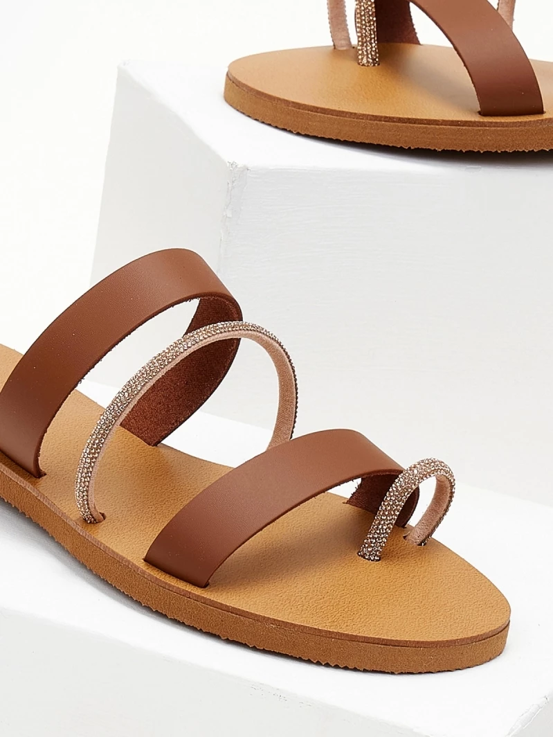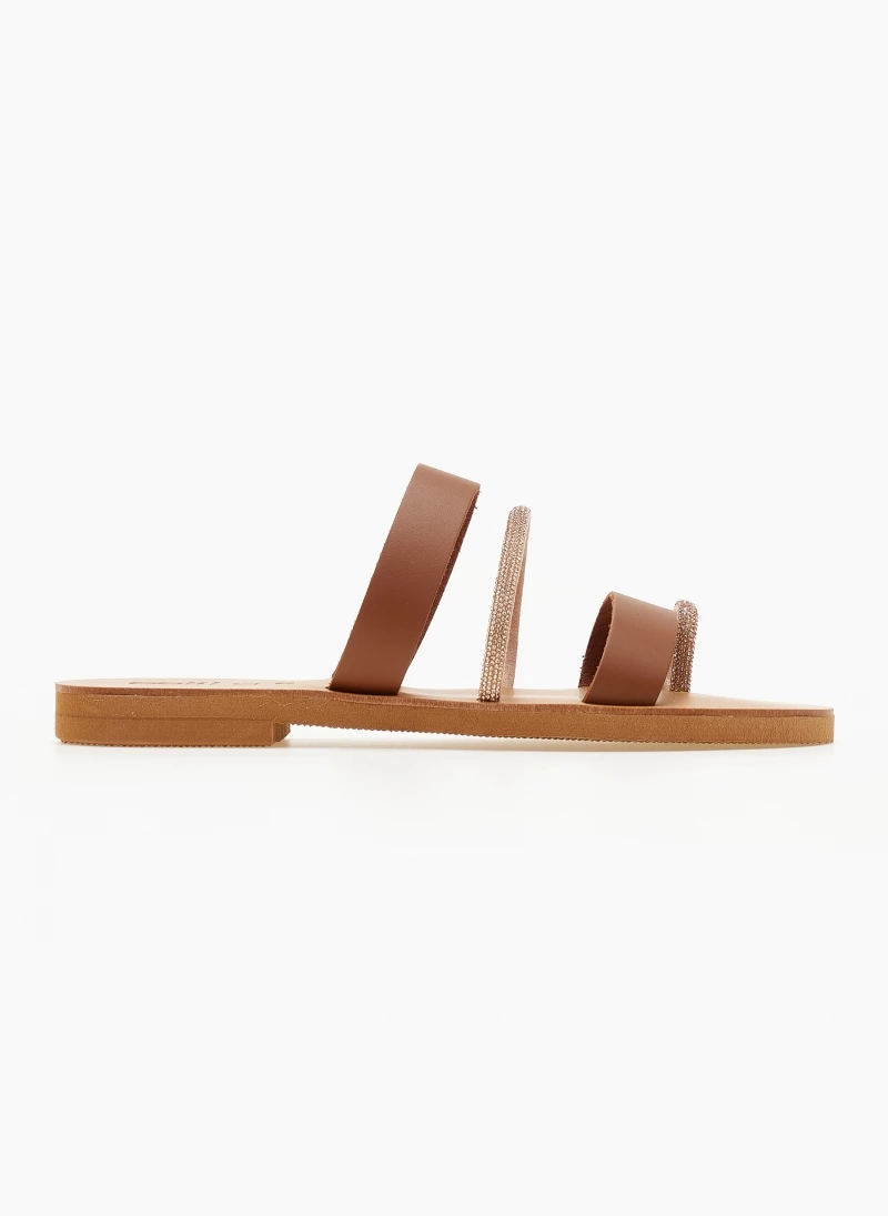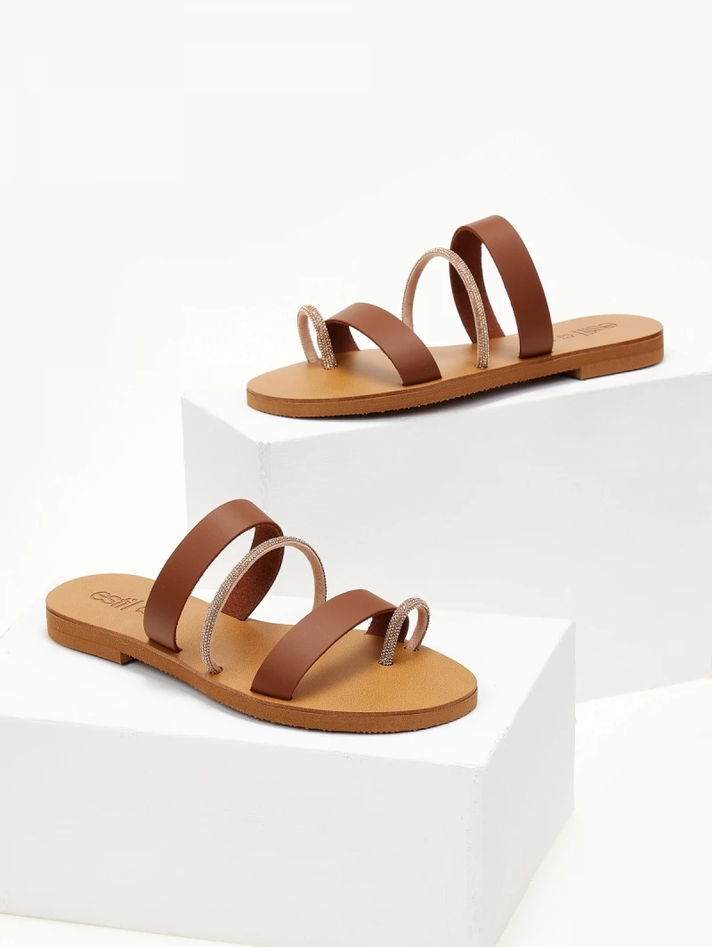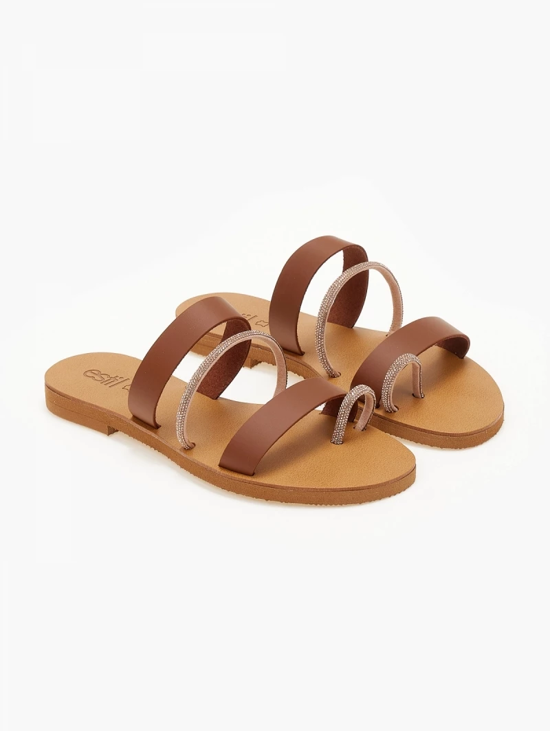 ESTIL δερμάτινα σανδάλια με τρείς φάσες. Έχουν λεπτή σειρά strass στή μεσαία φάσα και στο δάχτυλο. Γνήσιο δέρμα. ΄Ελληνικής κατασκευής.