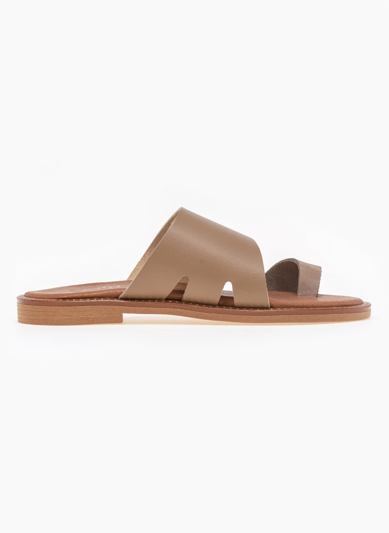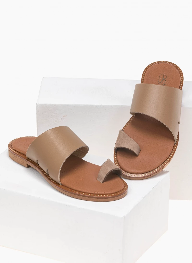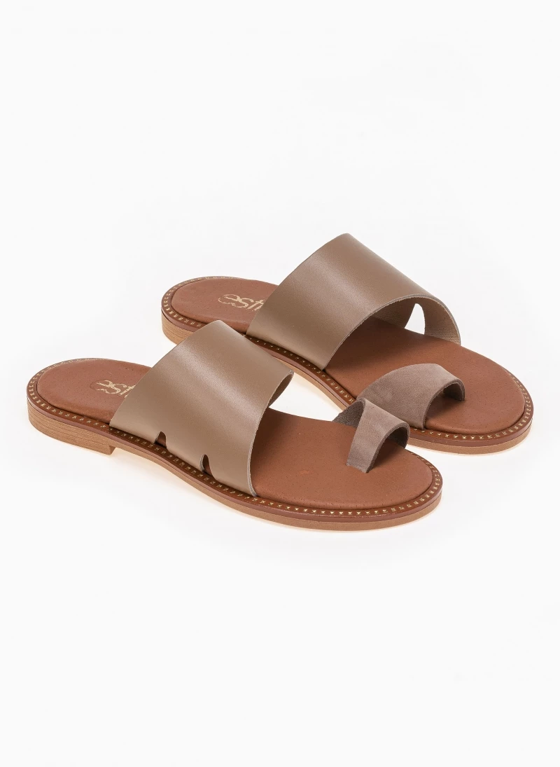 Estil δερμάτινα σανδάλια με λοξή φάσα με ανοίγματα. Ο πάτος είναι δερμάτινος με ενίσχυση. Έχουν λεπτομέρεια μεταλλικό χρώμα περιμετρικά της σόλας. Ελληνικής κατασκευής.