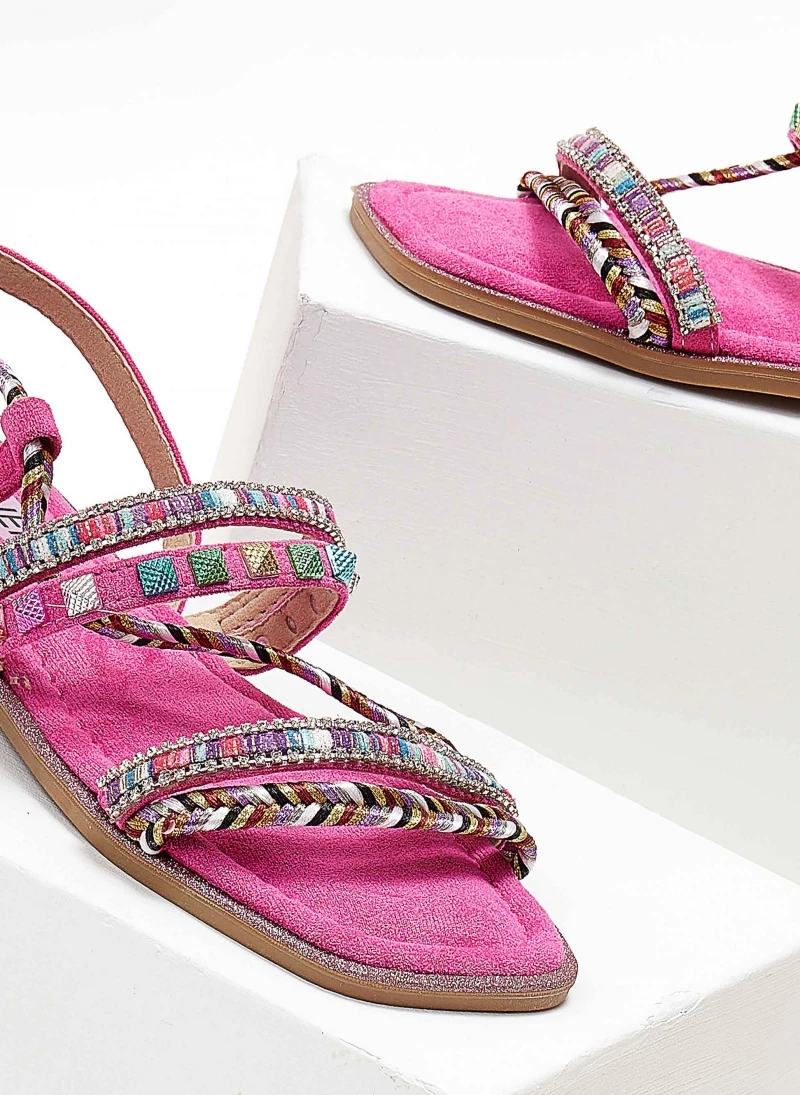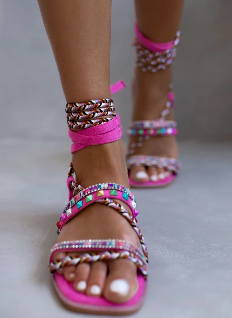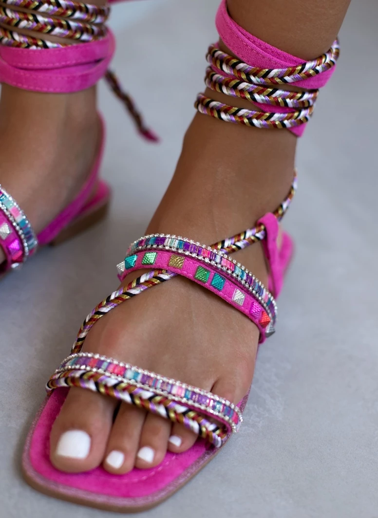 Σανδάλια suede σε συνδυασμούς χρωμάτων. Έχουν χρωματιστά τρουκς και διακριτικά strass. Δένουν με κορδόνια στο ύψος της γάμπας. Καρέ γραμμή.